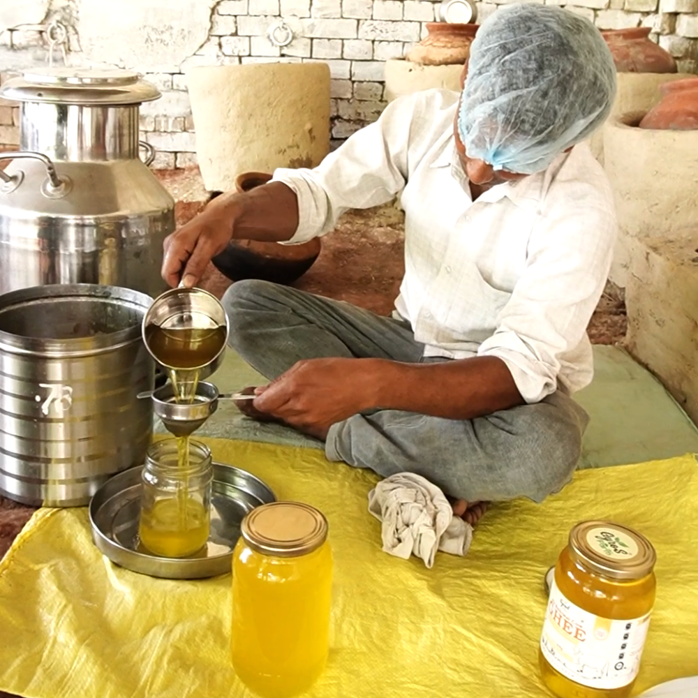 Skilled women from the village hand-churn this milk using bilona method.