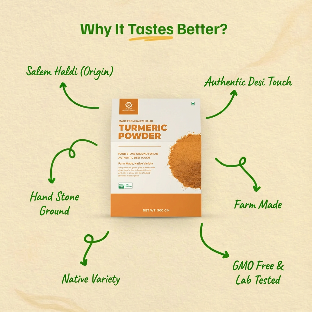 • Raw turmeric sourced from Salem, Tamil Nadu