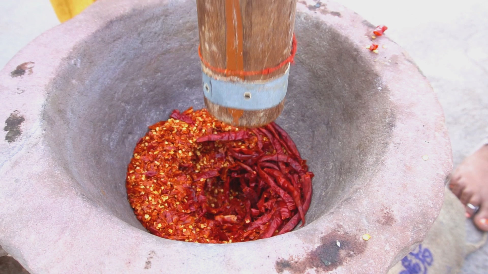 Then the chillies that have passed the quality tests are hand-ground into fine powder.